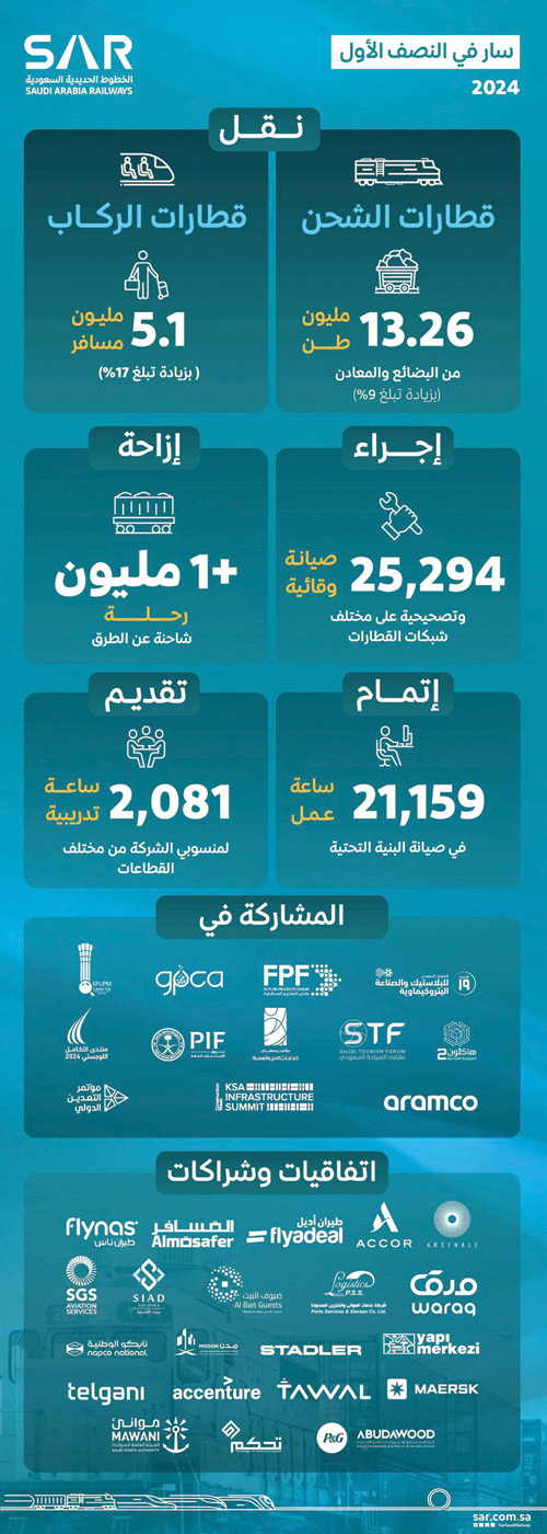 ونوَّه الدكتور المالك إلى أن هذا التميز على صعيد نتائج النصف الأول من عام 2024م لا تنحصر آثاره على خدمة الركاب المباشرة فحسب، بل تشمل الخدمات اللوجستية التي تقدمها «سار» للمساهمة في رفع مؤشرات الأداء اللوجستي للمملكة العربية السعودية، بما يلبي مستهدفات الاستراتيجية الوطنية للنقل والخدمات اللوجستية ورؤية السعودية 2030.