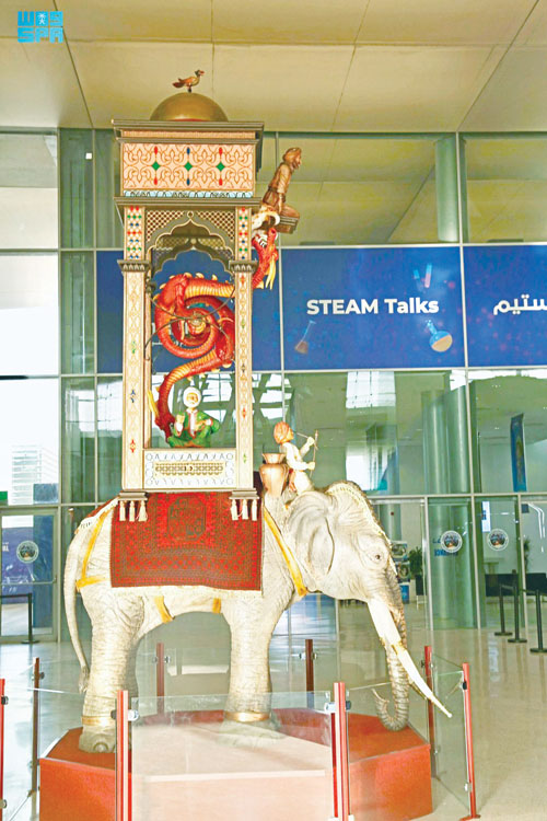 وساعة الفيل عمل فني مبهر يعكس الثقافات العريقة حيث يمثل الفيل الهنود والأفارقة، والتنين الثقافة الصينية، وطائر الفينيق الثقافة المصرية القديمة، ويمثل عمل المياه الثقافة اليونانية القديمة، والسجادة الثقافة الفارسية، وتمثل العمامة الثقافة الإسلامية. والساعة العربية التي اخترعها العالم الجزري قبل أكثر من 800 عام، موجودة نسخة طبق الأصل منها في مهرجان العلوم والتقنية «ستيم 2024» الذي تنظمه واحة الملك سلمان للعلوم حتى نهاية سبتمبر الحالي.