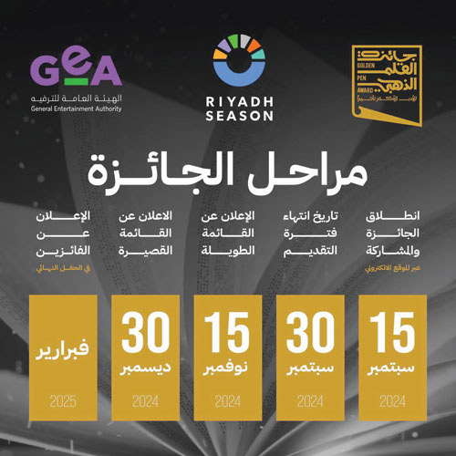 من جهته، أعلن رئيس جائزة «القلم الذهبي» الدكتورسعد البازعي، في مؤتمر صحافي أقيم على هامش حفل التدشين الرسمي للجائزة، عن المراحل الرئيسة لها، موضحا أن فتح باب التقديم للأعمال الأدبية سيبدأ من خلال الموقع الإلكتروني في الـ15 من سبتمبر الجاري، حتى تاريخ 30 من الشهر الجاري، ثم سيتم الإعلان عن القائمة الطويلة في الـ30 من نوفمبر المقبل، تليها القائمة القصيرة في الـ30 من ديسمبر 2024، ومن المقرر أن يتم الكشف عن الفائزين وتوزيع الجوائز في حفل كبير يقام في فبراير 2025، بحضور نخبة من الأدباء والمثقفين وصناع السينما ونجومها.