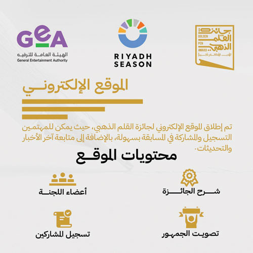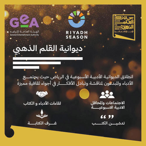 وفيما يتعلق بديوانية القلم الذهبي، أوضح معالي المستشار أنها ستكون مكان تجمع خاصا للأدباء، وعضويتها ستكون مجانية. كما ستكون هناك معايير خاصة لاختيار الأعضاء المستفيدين، حيث ستكون نقطة مشعة طوال العام في الوطن العربي.