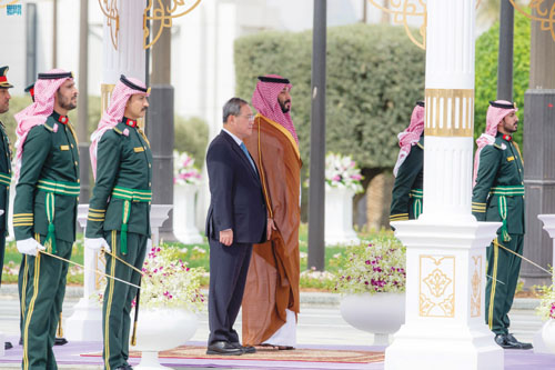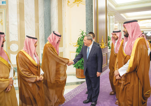وقد أجريت لدولته مراسم الاستقبال الرسمية، حيث عزف السلامان الملكي السعودي والوطني الصيني.