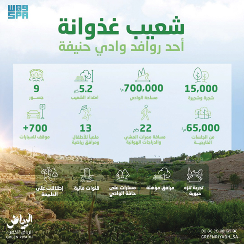 أعلن برنامج «الرياض الخضراء» عن انتهاء أعمال التأهيل البيئي لشعيب غذوانة أحد روافد وادي حنيفة، والتي جرت خلال 34 شهراً، بزراعة 15 ألف شجرة وشجيرة، حيث تم تحويله إلى متنزه طبيعي يمتد بطول 5.2 كيلو متر ويمر في أحياء ظهرة البديعة والسويدي والزهرة جنوب غرب مدينة الرياض، ويضيف لسكان مدينة الرياض حديقة شريطية وأماكن ترويحيّة تسهم في رفع جودة الحياة.