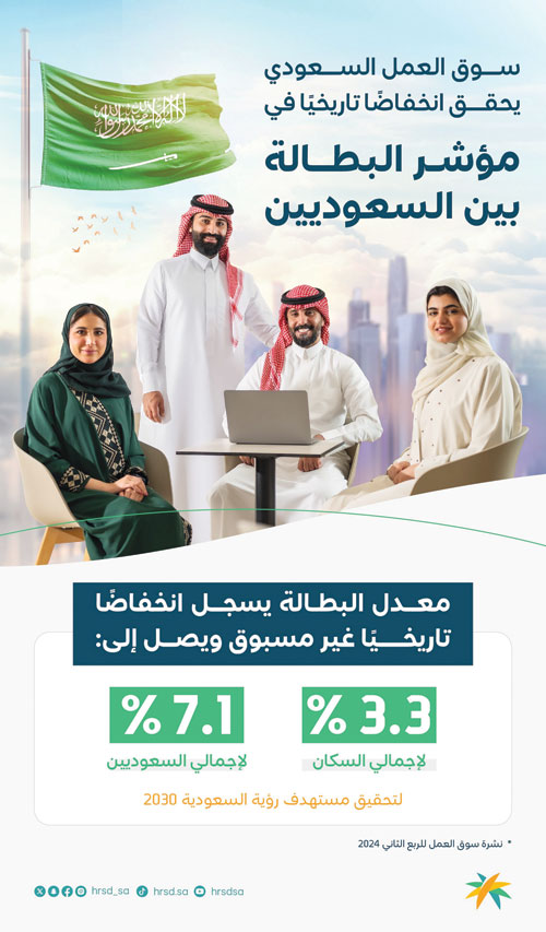 وبلغ معدل البطالة بين السعوديين 7.1 %، مقارنة بخط الأساس البالغ 12.3 %، ومتجاوزًا مستهدف 2023 البالغ 8 %، فيما يبلغ مستهدف الرؤية 7 %. ما عزز إيجاد مزيد من خلق الوظائف. وبخصوص الأشخاص ذوي الإعاقة القادرين على العمل، فقد بلغت نسبتهم 12.6 %، مقارنة بخط الأساس 7,7 %، متخطية مستهدف العام البالغ 12.3 %، فيما يبلغ مستهدف الرؤية 15 %.