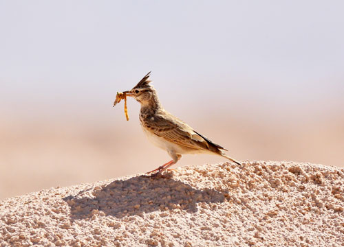 هنا قاطعني أبو سالم قائلاً: ذكرتني يا أبا فيصل بدراسة كنت قد أشرت إليها خلال إحدى محاضراتك بأن الطيور الصحراوية لا تتكاثر إلا إذا كان هنالك وفرة في الغذاء والتي تمثل الحشرات جزءاً كبير منه، كيف ذلك أستاذي؟ سعدت بمداخلة أبي سالم لألتقط لقيمات من تلك الكنافة العجيبة الطعم، وحقيقة لو لم نأكل سوى هذه الكنافة لأغنتنا، وأشبعتنا،بعد أن أخذت نصيبي من الكنافة التفت إلى أبي سالم... أين كنا! آه تذكرت سؤالك وإجابته نعم صحيح فالدراسات التي أجريت هنا بالمملكة تشير إلى أن طيور القبرات بأنواعها تتكاثر عند وجود وفرة بالغذاء، فمثلاً طائر المكاء والمعروف عند البادية بأم سالم Alaemon alaudipes تراه في موسم الربيع يتراقص لجذب الإناث لكن في فترات الجفاف فإن الذكور صحيح تتراقص والإناث تقوم ببناء الأعشاش لكن لا تضع البيض إلا بوجود غذاء وافر، فالأمطار الربيعية الجيدة تزيد من الرقعة الخضراء وهذه تزيد من وفرة الحشرات والتي تمثل الغذاء الرئيسي لهذه الطيور. وهذه النتائج توافق دراسات تمت بمناطق أخرى من العالم، وعليه يمكن القول إن وفرة الغذاء يساهم في تحفيز الطيور على التكاثر، وقلة الحشرات سوف تؤثر على معظم الطيور المهاجرة والمقيمة.