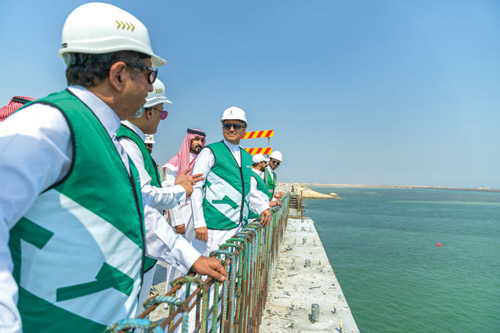 وقف معالي وزير النقل والخدمات اللوجستية رئيس مجلس إدارة الهيئة العامة للطرق المهندس صالح بن ناصر الجاسر على مشروع طريق (صفوى/ رحيمة) بطول 15 كم، الذي يتضمن الجسر البحري (صفوى/ رأس تنورة) والذي يعد الأول من نوعه داخل المملكة، حيث تفقد معاليه برفقة معالي رئيس الهيئة العامة للطرق المكلف المهندس بدر بن عبدالله الدلامي، سير العمل في المشروع ومعدلات الإنجاز.