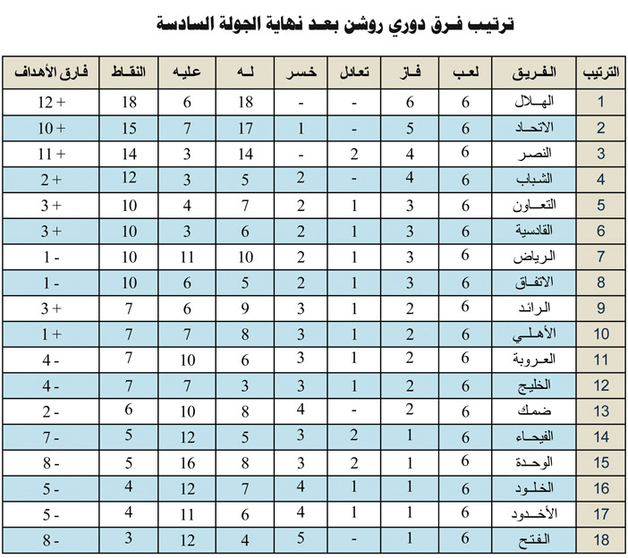 شهدت الجولة السادسة من دوري روشن للمحترفين محافظة فريق الهلال على صدارة الترتيب بعد فوزه الثمين على فريق الأهلي في جدة بهدفين مقابل هدف واحد، وواصل الاتحاد مطاردته للمتصدر بعد تجاوز الأخدود في نجران، وواصل النصر تقدمه نحو الأمام بعد فوزه على العروبة بثلاثية، واقتربت خمسة أندية من المنافسة على المراكز الثلاثة الأولى وهي الشباب والتعاون والقادسية والرياض والاتفاق.