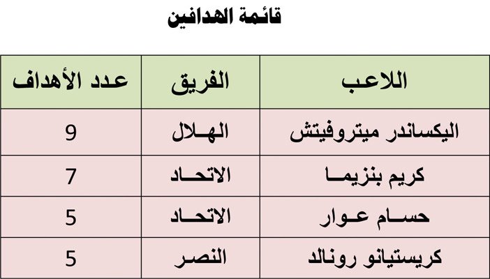 كان نصيب اللاعبين الأجانب من الأهداف المسجلة خلال الجولات الأربع الماضية (114) هدفاً، فيما سجل اللاعبون المحليين (32) هدفاً، ويأتي المهاجم الهلالي الكساندر ميتروفيتش في صدارة الهدافين برصيد 9 أهداف من 6 مباريات، يليه كريم بنزيما من الاتحاد برصيد 7 أهداف.
