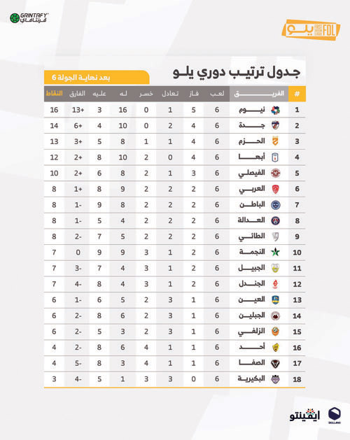 انفرد فريق نيوم بصدارة ترتيب دوري يلو لأندية الدرجة الأولى للمحترفين بعد مرور 6 جولات، وذلك بعد انتصاره على فريق الحزم بهدفين دون مقابل في قمة مباريات الجولة السادسة، ليرفع نيوم رصيده إلى 16 نقطة في الصدارة، وتراجع الحزم بعد خسارته للمركز الثالث برصيد 13 نقطة.