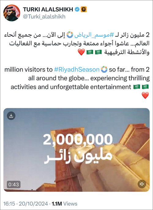 أعلن معالي رئيس مجلس إدارة الهيئة العامة للترفيه (GEA) المستشار تركي بن عبدالمحسن آل الشيخ، أمس، عن تحقيق موسم الرياض 2024 رقما قياسيا جديدا بعدد زيارات بلغ مليوني زائر، خلال أسبوع من انطلاقته، مما يعكس الشغف الكبير بالموسم الذي ينتظره الجمهور سنويا.
