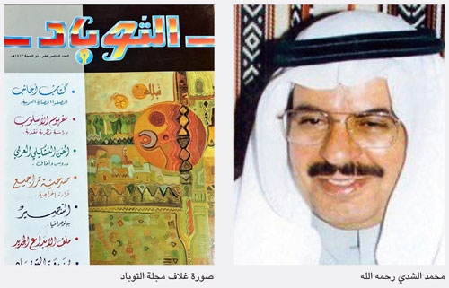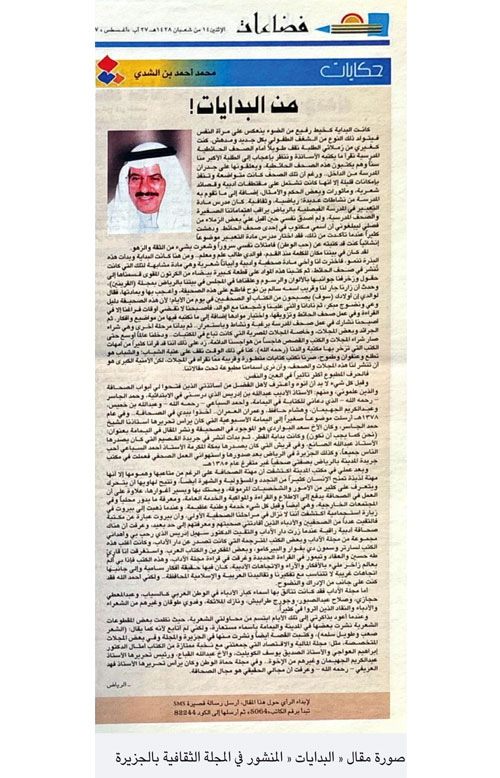 الفقيد الراحل الشدي الذي يعد من رموز الثقافة والصحافة في بلادنا والذي قال عن نفسه رحمه الله: «لقد كان في بيتنا مكان للكلمة منذ القدم، فوالدي طالب علم ومعلم ومن هنا كانت البداية وبدأت هذه البذرة تنمو، فاخترت أنا وأخي مادة صحفية وأدبية وأبيات شعرية، وهي مادة مشابهة لتلك التي كانت تنشر في صحف الحائط، ثم كتبنا هذه المواد على قطعة كبيرة بيضاء من الكرتون المقوى قسمناها الى حقول وزخرفنا جوانبها بالألوان والرسوم وعلقناها في المجلس في بيتنا بالرياض، بمحله (القرينين) وحدث ان زارنا جار لنا وقريب اسمه سالم بن نوح فاطلع على هذه الصحيفة وأعجب بها وبمادتها، فقال لوالدي رحمه الله ان اولادك سوف يصبحون من الكتاب او الصحفيين في يوم من الأيام» (هذا الكلام كتبه الفقيد في شعبان عام 1428 قبل 17 سنه) في «الجزيرة الثقافية» في زاويته «حكايات» التي استمرت أكثر من خمس سنوات حسب علمي.