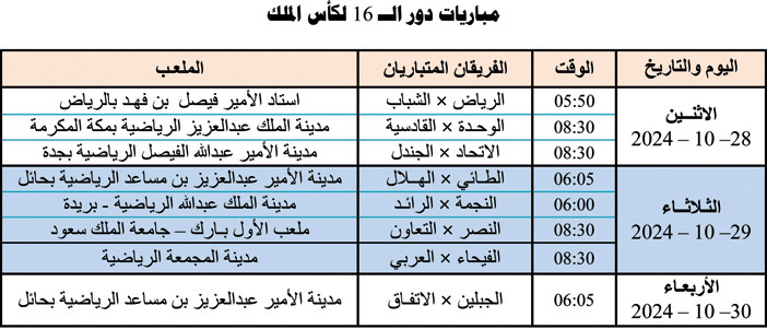 تقام مساء اليوم الاثنين ثلاث مباريات تفتتح معها مباريات دور الـ16 من مسابقة كأس خادم الحرمين الشريفين، والتي ستقام على النحو التالي: