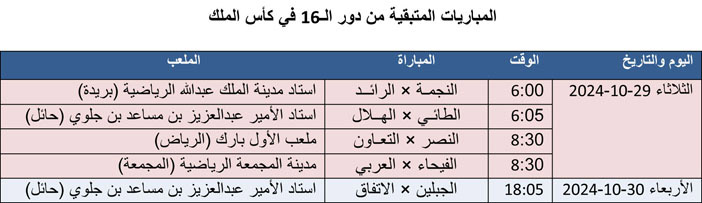 تتواصل مساء اليوم الثلاثاء مباريات دور الـ16 من مسابقة كأس خادم الحرمين الشريفين بإقامة 4 مباريات.. وستكون على النحو التالي: