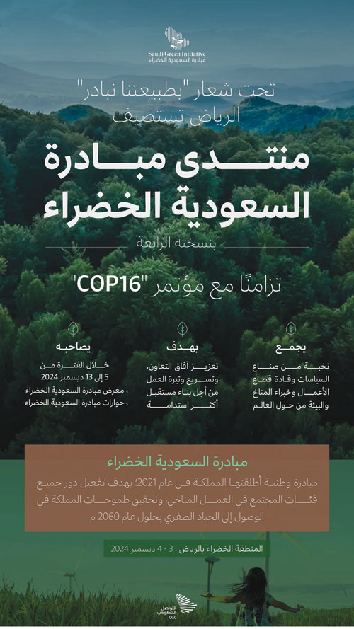 ومن المقرر أن يجمع المنتدى السنوي هذا العام المئات من صنّاع السياسات وقادة قطاع الأعمال والخبراء من جميع أنحاء العالم في الجناح المخصص لمبادرة السعودية الخضراء في المنطقة الخضراء بمؤتمر الرياض COP16.