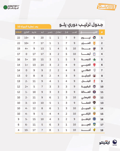 رغم تعثّره بالخسارة في الجولة التاسعة من الجبلين 1-0، حافظ فريق نيوم على صدارته ترتيب دوري يلو لأندية الدرجة الأولى للمحترفين بعد مرور 10 جولات برصيد 22 نقطة متفوقًا بفارق الأهداف على فريق الحزم صاحب المركز الثاني “ الذي يملك نفس الرصيد 22 “ بعدما كسب حزم الصمود ضيفه جدة بثلاثية نظيفة في الجولة العاشرة في الرس.