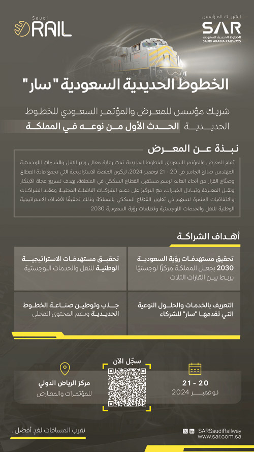 يُقام المؤتمر والمعرض السعودي للخطوط الحديدية السعودية «سار» تحت رعاية معالي وزير النقل والخدمات اللوجستية المهندس صالح الجاسر يومي الأربعاء والخميس الموافقين 20 - 21 نوفمبر 2024، ليكون منصةً استراتيجية تجمع قادة القطاع وصنّاع القرار من أنحاء العالم لرسم مستقبل القطاع السككي في المنطقة، بهدف تسريع عجلة الابتكار ونقل المعرفة وتبادل الخبرات، مع التركيز على دعم الشركات الناشئة المحلية، وعقد الشراكات والاتفاقيات المثمرة لتسهم في تطوير القطاع السككي بالمملكة، ويأتي ذلك تحقيقًا للاستراتيجية الوطنية للنقل والخدمات اللوجستية وتطلعات رؤية السعودية 2030 .