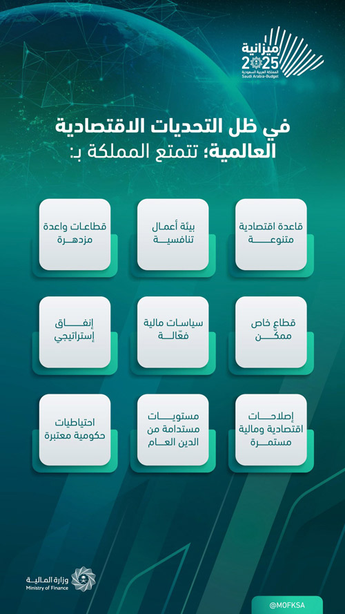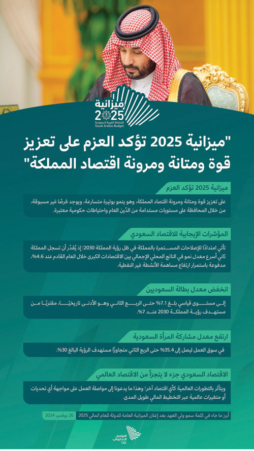 وأضاف سموه أن ميزانية 2025م تؤكد العزم على تعزيز قوة ومتانة ومرونة اقتصاد المملكة، وهو ينمو بوتيرة متسارعة ويوجد فرصاً غير مسبوقة، من خلال المحافظة على مستويات مستدامة من الدين العام واحتياطات حكومية معتبرة، إضافة إلى سياسة إنفاق مرنة تمكّنها من مواجهة التحديات والتقلبات في الاقتصاد العالمي، مشيراً إلى أن الإصلاحات المالية التي قامت بها المملكة انعكست إيجابياً على تصنيفاتها الائتمانية؛ نتيجةً لتبني الحكومة سياسات مالية تسهم في المحافظة على الاستدامة المالية وكفاءة التخطيط المالي.