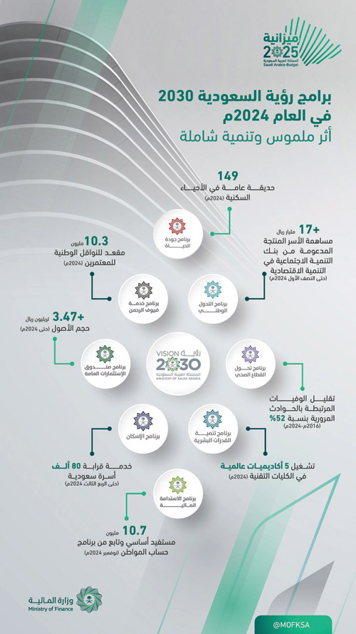 وقال سموه إن: «المؤشرات الإيجابية للاقتصاد السعودي تأتي امتداداً للإصلاحات المستمرة في المملكة في ظل رؤية المملكة 2030؛ إذ يقدر أن تسجل المملكة ثاني أسرع معدل نمو في الناتج المحلي الإجمالي بين الاقتصادات الكبرى خلال العام القادم عند (4.6%)، مدفوعة باستمرار ارتفاع مساهمة الأنشطة غير النفطية والتي بلغت مستوى قياسياً جديداً لها خلال العام 2024م عند (52 %)، وانخفض معدل بطالة السعوديين إلى مستوى قياسي بلغ (7.1%) حتى الربع الثاني وهو الأدنى تاريخياً، مقترباً من مستهدف رؤية المملكة 2030 عند (7 %)، كما ارتفع معدل مشاركة المرأة السعودية في سوق العمل ليصل إلى (35.4 %) حتى الربع الثاني متجاوزاً مستهدف الرؤية البالغ (30 % )، وبلغ صافي تدفقات الاستثمار الأجنبي (21.2) مليار ريال خلال النصف الأول من عام 2024م، ويعكس ذلك اهتمام حكومة خادم الحرمين الشريفين -حفظه الله- بجميع فئات المجتمع».