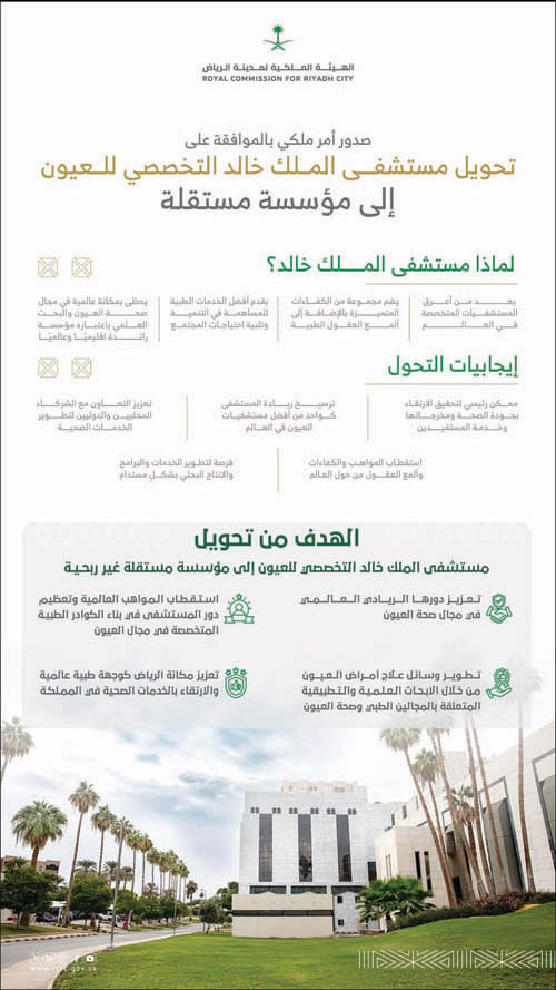 صدر أمر ملكي كريم يقضي بالموافقة على النظام الأساس لمستشفى الملك خالد التخصصي للعيون ومركز الأبحاث، وتحويله إلى مؤسسة مستقلة ذات طبيعة خاصة غير هادفة للربح تحت مظلة الهيئة الملكية لمدينة الرياض.
