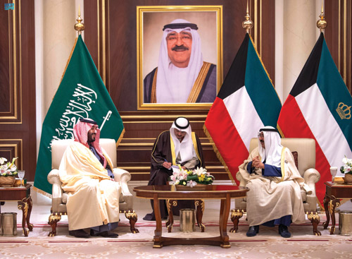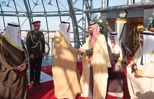 وقد اصطحب سمو أمير دولة الكويت، سمو ولي العهد إلى قصر بيان (مقر القمة).