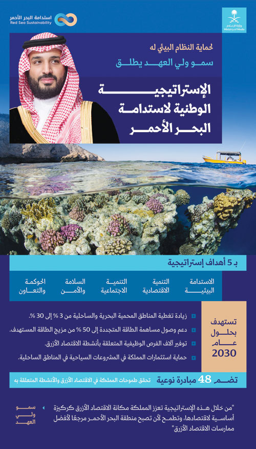 أطلق صاحب السمو الملكي الأمير محمد بن سلمان بن عبد العزيز آل سعود ولي العهد رئيس مجلس الوزراء رئيس مجلس الشؤون الاقتصادية والتنمية -حفظه الله- الاستراتيجية الوطنية لاستدامة البحر الأحمر، الهادفة لحماية النظام البيئي للبحر الأحمر، وتعزيز أطر التعاون لاستدامته، وتمكين المجتمع ودعم التحول إلى اقتصاد أزرق مستدام بما يحقق التنوع الاقتصادي ويتماشى مع مستهدفات رؤية المملكة 2030، والأولويات الوطنية لقطاع البحث والتطوير والابتكار التي أُطلقت مسبقًا، وأهمها استدامة البيئة والاحتياجات الأساسية.