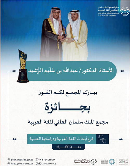 وأوضح الدكتور العمار أن المجمع، من خلال هذه الجائزة المتميزة، يسير على خطى واضحة تتماشى مع رؤية المملكة 2030، بقيادة سمو ولي العهد الأمير محمد بن سلمان -حفظه الله-. وأكد أن الجائزة بما تحمله من اسم شامخ وطابع علمي متميز وعمق معرفي، تظل شاهدًا حيًا على الأداء المتميز الذي يقدمه المجمع منذ إنشائه.