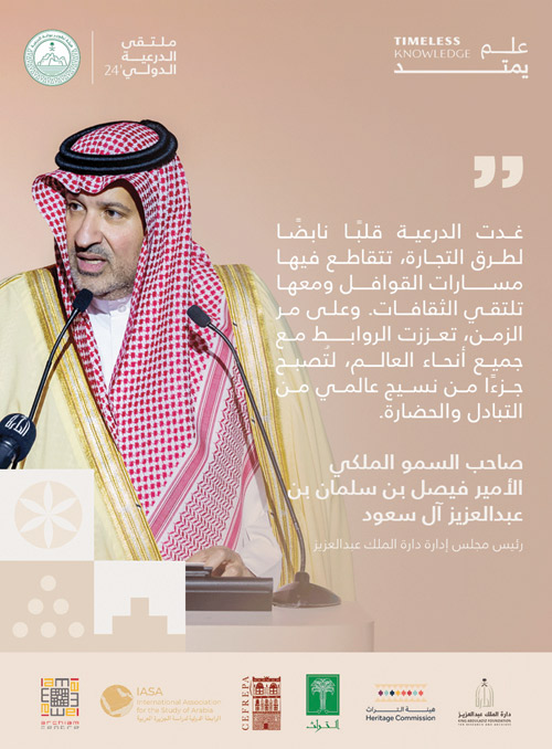 رعى صاحب السمو الملكي الأمير الدكتور فيصل بن سلمان بن عبدالعزيز مستشار خادم الحرمين الشريفين ورئيس مجلس إدارة دارة الملك عبدالعزيز ورئيس مجلس أمناء مكتبة الملك فهد الوطنية ملتقى الدرعية الدولي 24 الذي أقامته هيئة تطوير بوابة الدرعية، ويناقش دور منطقة الدرعية في المجال التاريخي والحضاري والتجاري على مدى يومين في مطل البجيري.