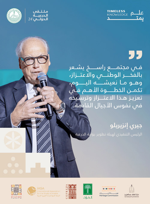 وقد ألقى الرئيس التنفيذي لهيئة تطوير بوابة الدرعية السيد جيري إنزيريلو كلمة رحب فيها بالمشاركين حيث استعرض دور الدرعية التاريخي والحضاري والتجاري مشيدا بالحقبة التاريخية لهذه المنطقة وموقعها التاريخي والدرعية هي قصة هذه الأرض درعية النماء والبناء والحضارة الوطنية.