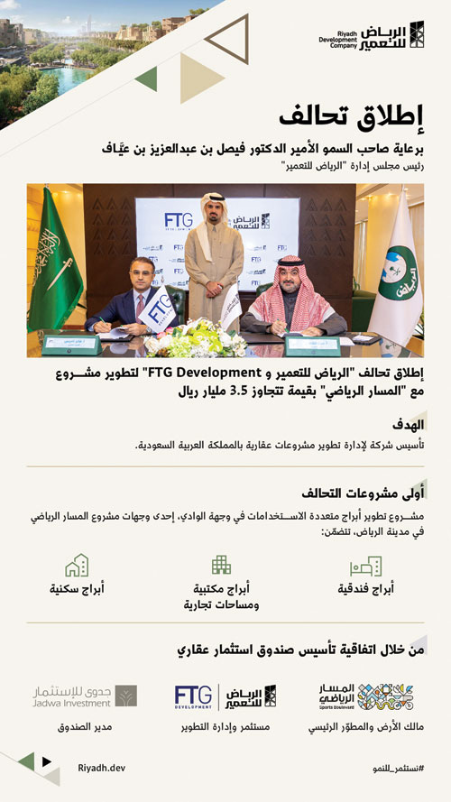 ويستهدف المشروع بناء أبراج متعددة الاستخدام سيتم تنفيذها وفقًا للكود العمراني للمسار الرياضي المستمد من مبادئ العمارة السلمانية، وسيمتد على مساحة تقارب الـ40,000 متر مربع ضمن مشروع المسار الرياضي لتستخدم كتطوير متعدد الاستخدامات بإجمالي مسطحات بناء تتجاوز الـ207,000 متر مربع.وتحقق هذه الشراكة التكامل بين الخبرات المحلية التي تمتلكها شركة «الرياض للتعمير»، التي تتمتع بخبرة كبيرة في تطوير المشاريع العقارية داخل المملكة، والخبرة العالمية التي تمتلكها «FTG Development»، خاصة في تطوير وإدارة المشاريع العقارية السكنية والفندقية في مختلف أنحاء العالم.