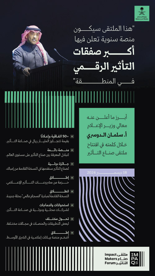 وعبّر معالي وزير الإعلام في كلمته الافتتاحية عن أهمية الدور المتنامي للمؤثرين، مشددًا على أهمية استثمار هذا التأثير في تعزيز الإبداع والابتكار وتحفيز الأفراد نحو التنمية المجتمعية والاقتصادية.وقال: «إن رؤية المملكة 2030 بقيادة سمو سيدي ولي العهد الأمير محمد بن سلمان -حفظه الله-، رؤية ألهمت العالم، وصنعت التأثير».وأضاف معاليه في الكلمة التي قدمها أمام أكثر من 1500 ضيف في مسرح ميادين بالدرعية مقر انعقاد ملتقى صنّاع التأثير ImpaQ: «التأثير ربما يكون كلمة واحدة، من شخصٍ عابر، قد تغير حياةَ أحدِهم إيجابًا إلى الأبد، أو من بائع متجول، يحاول أن يجمع قوت يومه لأولاده، أو من أبٍ مكافحٍ تملؤه المحبة الصادقة، أو أم عظيمة تصنع المستحيل لتغرس القيم في نفوس صغارها، التأثير ليس منحصرًا على المنصات والشاشات فقط، فتّش وتأمل حولك في العمل، في النادي، في الحي، في عائلتك، في بيتك، سترى أمامك من صنع شخصيتك وحياتك.. ImpaQ يحتفي بهم وبكم جميعًا».