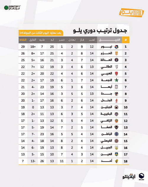 أقيمت خلال الثلاثة أيام الماضية 8 مباريات ضمن الجولة 14 من دوري يلو لأندية الدرجة الأولى للمحترفين، وتختتم الجولة اليوم الجمعة بلقاء يجمع المتصدر نيوم بضيفه جدة في تبوك.