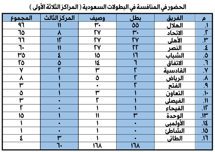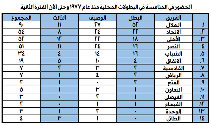 - خلاصة هذه الأرقام تثبت حضور الأندية الخمسة الكبار في المنافسة على البطولات المحلية بحضورها الطاغي في تحقيق البطولات بواقع 150 بطولة توزعت بينها أكثرها الهلال 55 بطولة وأقلها الشباب 16 بطولة، فيما جاءت الفرق الخمسة في الوصافة 126 مرة جاء الهلال أولاً 30 مرة والأقل الشباب 15 مرة وفي المركز الثالث 46 مرة، حضرت فيها الأندية الخمسة أكثرها الأهلي بـ12 مرة وأقلها الشباب كذلك بـ4 مرات.