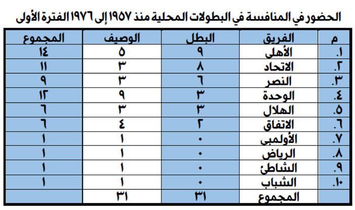 بعد تنظيم أول مسابقة محلية وهي كأس الملك عام 1957إلى عام 1976 قبل انطلاقة أول دوري ممتاز مرت البطولات بعدد من التوقفات وتغير اللوائح شملت 5 بطولات هي كأس الملك وكأس ولي العهد والدوري العام وكأس الاتحاد والدورة التصنيفية ومعها فرض الأهلي نفسه كأكثر الأندية تحقيقاً للألقاب بـ9 بطولات، فيما جاء الفريق الوحداوي كأكثر الأندية حضوراً في الوصافة بواقع 9 مرات وهو ثاني أكثر الأندية حضوراً في المنافسة بطلاً أو وصيفاً بواقع 12مرة بعد الأهلي بـ14 مرة.