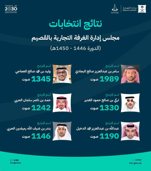 أعلنت اللجنة المشرفة على انتخابات أعضاء مجلس إدارة الغرفة التجارية في القصيم للدورة (1446 - 1450هـ)، عن صدور نتائج الانتخابات بعد انتهاء عملية الإدلاء بالأصوات مساء اليوم، عبر نظام التصويت الإلكتروني وفقًا لنظام الغرف التجارية .