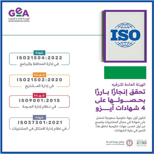 استمراراً للتميز والكفاءة، والتزام الهيئة العامة للترفيه (GEA) بتطبيق أعلى المعايير العالمية في أعمالها، حصلت الهيئة على مجموعة من شهادات الاعتماد الدولية في مجالات الجودة والامتثال، ما يعزز مكانتها كجهة رائدة في القطاع الحكومي.