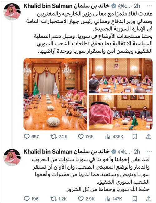 ووصف سمو وزير الدفاع اللقاء بالمثمر، وقال سموه في منشور على حسابه في منصة «إكس»: «لقد عانى إخواننا وأخواتنا في سوريا سنوات من الحروب والدمار والوضع المعيشي الصعب، وآن الأوان أن تستقر سوريا وتنهض وتستفيد مما لديها من مقدرات وأهمها الشعب السوري الشقيق.. حفظ الله سوريا وحماها من كل الشرور».