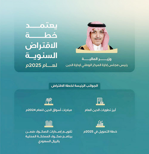 اعتمد معالي وزير المالية الأستاذ محمد بن عبدالله الجدعان خطة الاقتراض السنوية للعام المالي 2025م، وذلك بعد أن صادق عليها مجلس إدارة المركز الوطني لإدارة الدين.