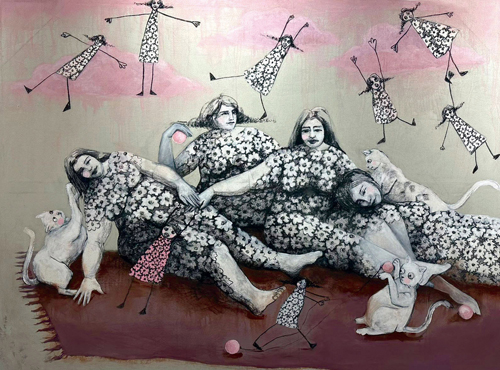 أما الفنانة التشكيلية مهدية آل طالب فاختارت التكوين الاجتماعي واجتماع الأسرة أو الصديقات بحالة من الحنين والشوق والألفة والذكريات بين مجموعة من الفتيات والقطط تتراقص بينهم مع الذكريات التي تزهر في خيالات تلك الفتيات.