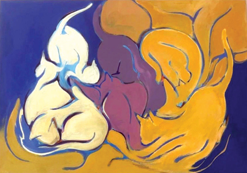 واختارت الفنانة التشكيلية موضي الشمري قطط الشارع التي تجتمع على الأرصفة بتجريد مميز وألوان هادئة برزت في جل أعمالها المشاركة، لتعكس من خلالها إبداعاً فنياً وتكويناً بصرياً مميزاً.