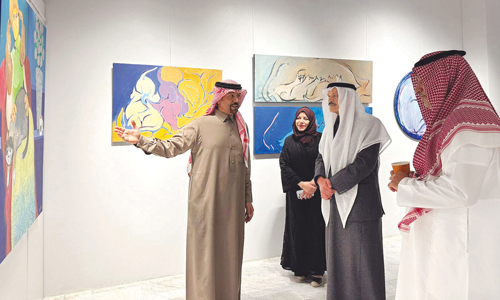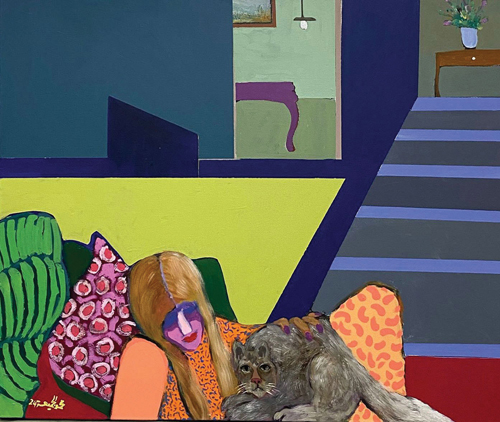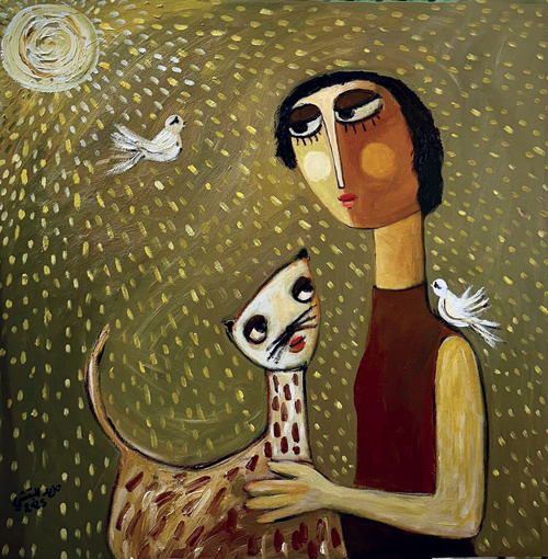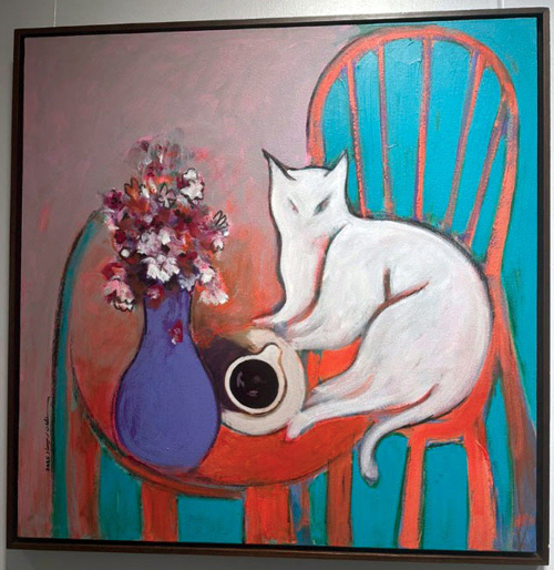 وشارك الفنان التشكيلي محمد الجميعة بألوانه الجريئة وتكويناته الإبداعية التي ناغمت بين اللون والعنصر بحالات ومشاعر بين المرأة والقطة التي تصطحبها لتكون أنيستها في وحدتها وصديقتها التي تحاورها.