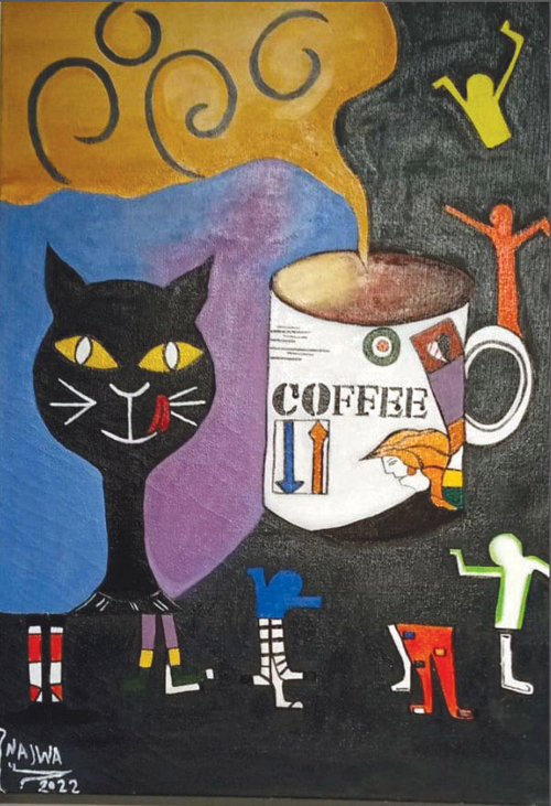 وشاركت الفنانة التشكيلية نجوى أبو طالب بعملين جمعت فيهما بين مفردتي القهوة والقطة، لتعبر من خلالهما عن كونهما صديقتا الإنسان في غالب أوقاته.