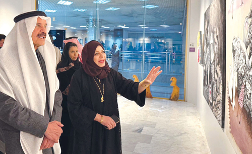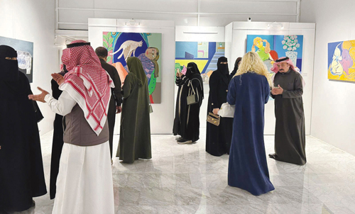 حيث بدأ المعرض بعملين للفنانة التشكيلية تغريد البقشي جامعة بين المرأة والقطة بأسلوبها التعبيري المميز واختيارها للألوان التي تعكس مشاعر وأحاسيس تنوعت بين شعاع الشمس حيناً وزخات المطر في حين آخر.