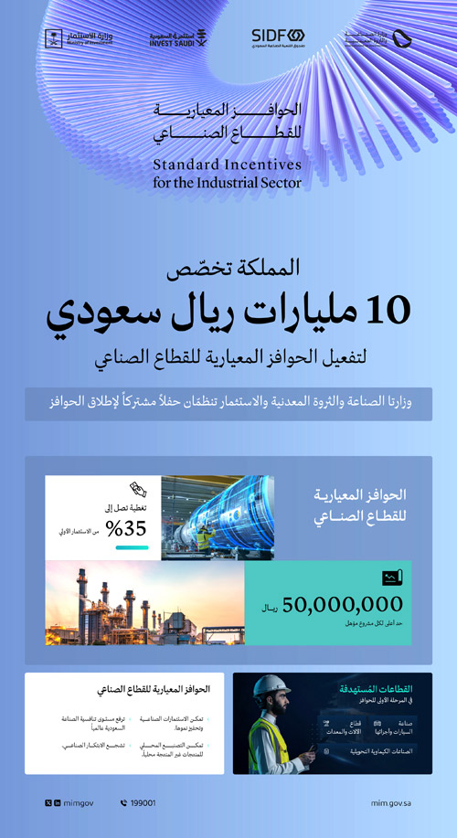 جاء في الإعلان أن الحوافز المعيارية للقطاع الصناعي تتضمن تغطية تصل إلى 35 % من الاستثمار الأولي للمشروع، بحد أعلى يبلغ 50 مليون ريال لكل مشروعٍ مؤهل، مقسّمة، بشكل متوازنٍ، على مراحل المشروع الاستثماري، بحيث تكون 50 % لمرحلة الإنشاء، و50 % لمرحلة الإنتاج.