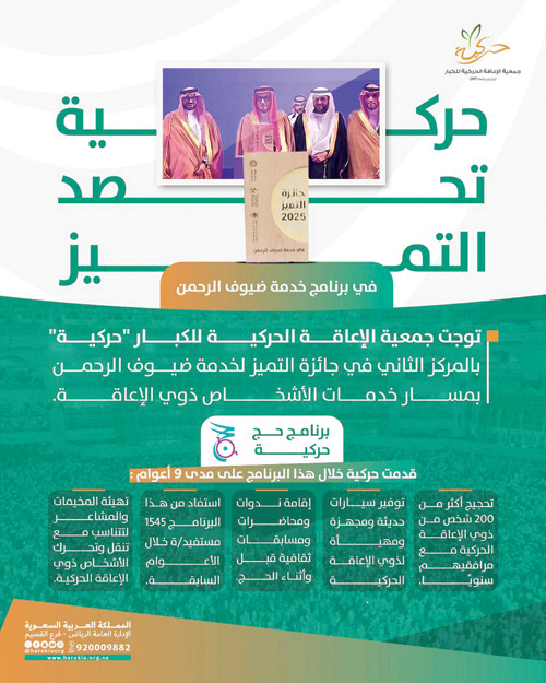 حصلت جمعية الإعاقة الحركية للكبار «حركية» على المركز الثاني في جائزة التميز لخدمة ضيوف الرحمن ضمن فعالية مؤتمر ومعرض الحج 2025م بمسار خدمات رعاية الأشخاص ذوي الإعاقة.