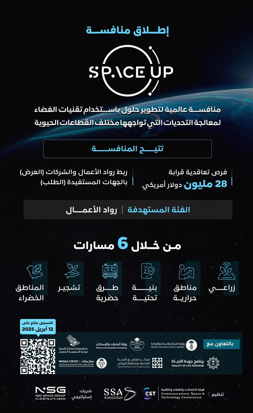 أطلقت هيئة الاتصالات والفضاء والتقنية ووكالة الفضاء السعودية منافسة SpaceUp العالمية، بالشراكة مع مجموعة نيو للفضاء؛ وذلك بهدف تعزيز ريادة أعمال الفضاء، ودعم الشركات المحلية المتخصصة في مجال حلول تقنيات الفضاء، وجذب الشركات الناشئة العالمية والمنشآت الصغيرة والمتوسطة، وتشجيع تبني حلول تقنيات الفضاء التي تدعم مختلف القطاعات الحيوية.
