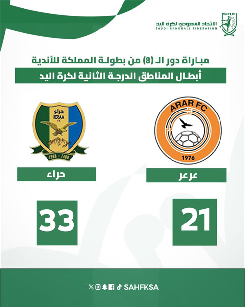 تأهل نادي حراء إلى الدور نصف النهائي من بطولة المملكة لكرة اليد للأندية أبطال المناطق للدرجة الثانية، بعدما تغلب على نظيره عرعر (33-21)، خلال المواجهة التي جمعتهما على صالة مدينة الأمير عبدالله بن مساعد بعرعر، في ختام مواجهات الدور ربع النهائي. وكانت أندية: القادسية والعروبة والشباب، قد حسمت تأهلها إلى الدور النصف النهائي، قبل أن ينضم إليها حراء.