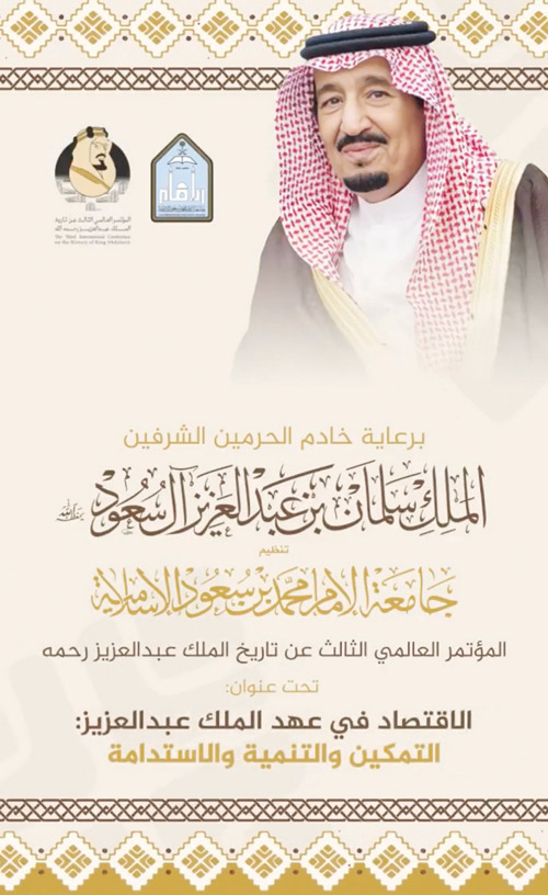 تحت رعاية خادم الحرمين الشريفين الملك سلمان بن عبدالعزيز آل سعود -حفظه الله-، تنظم جامعة الإمام محمد بن سعود الإسلامية اليوم الاثنين، فعاليات المؤتمر العالمي الثالث عن تاريخ الملك عبدالعزيز -رحمه الله- تحت عنوان «الاقتصاد في عهد الملك عبدالعزيز.. التمكين والتنمية والاستدامة» في مقر الجامعة بالرياض.