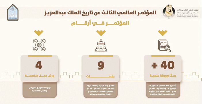 ويشهد المؤتمر مناقشة مجموعة من الأوراق العلمية التي تسلط الضوء على النهج الاقتصادي الرائد للملك عبدالعزيز، ومنها التحول النفطي في سياسة الملك عبدالعزيز الاقتصادية، والفكر الاقتصادي للملك عبدالعزيز: دراسة تحليلية لتوجهاته وتأثيراته على التحول الاقتصادي في المملكة، والتحديات الاقتصادية التي واجهت الملك عبدالعزيز في تنمية المملكة، والتنمية الاقتصادية المستدامة للإنسان السعودي في عهد الملك عبدالعزيز: النظام الصحي أنموذجًا، والدور الاقتصادي لميناء جدة في عهد الملك عبدالعزيز، واقتصاديات الثروة الحيوانية والسمكية في عهد الملك عبدالعزيز. وتنعقد فعاليات المؤتمر في مبنى المؤتمرات بالمدينة الجامعية بالرياض، ابتداءً من الساعة الواحدة ظهرًا، بمشاركة نخبةٍ من الباحثين والمختصين من داخل المملكة وخارجها، لتقديم رؤى وأفكار تسهم في تسليط الضوء على دور الملك عبدالعزيز -رحمه الله- في بناء أسس النهضة.