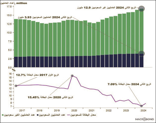 إن اتجاهات سوق العمل في المملكة العربية السعودية تشير إلى تباين ملحوظ في حجم القوى العاملة السعودية وغير السعودية. ويهيمن العاملون غير السعوديين على سوق العمل حيث ارتفع عددهم من 9.36 مليون عامل في الربع الثالث 2021 بوتيرة سريعة ليبلغ عددهم 12.9 مليون عامل في الربع الثاني من عام 2024، وفي المقابل ارتفع عدد العاملين السعوديين من 3.28 مليون عامل إلى 3.93 مليون عامل خلال نفس الفترة.