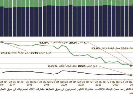 ومع ذلك، شهدت مشاركة الإناث في القوى العاملة نموًا ملحوظًا، مما يعكس إصلاحات اجتماعية واقتصادية كبيرة تتماشى مع رؤية السعودية 2030. وقد ارتفعت مشاركة الإناث من 17.4 % فقط في الربع الأول من عام 2017 إلى 36.2 % بحلول الربع الثالث من عام 2024، أي أكثر من الضعف في غضون سبع سنوات. وهذا يسلط الضوء على الجهود المستمرة لدمج المرأة في القوى العاملة، وهو عنصر أساسي في أجندة التحديث في المملكة العربية السعودية والتنويع الاقتصادي، على النحو المبين في مبادرات رؤية 2030.