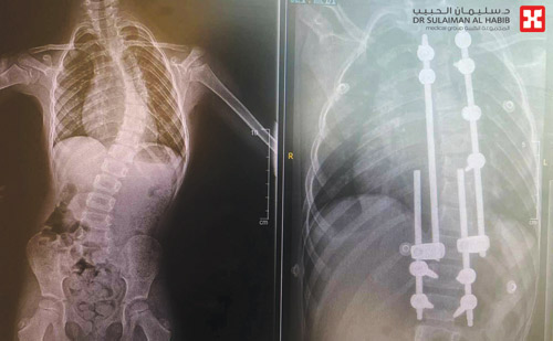 واستطرد قائلاً إن الطفلة أجريت لها عدة فحوصات دقيقة، حيث بينت أشعة الرنين المغناطيسي M.R.I، والفحص السريري، إصابتها بانحراف في الفقرات الـصدرية. وقد أجري لها عملية جراحية، تم فيها تقويم العمود الفقري بهذه التقنية المتقدمة، مع استخدام أجهزة حديثة كمراقبة الأعصاب أثناء الجراحة، وتكللت جهود الفريق الطبي -ولله الحمد- بالنجاح التام، إذ استطاعت الطفلة المشي في نفس اليوم واستردت المظهر الطبيعي، وبعد «4» أيام غادرت المستشفى بحالة صحية جيدة.